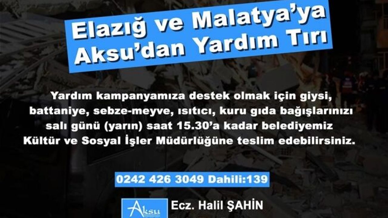 Merkez üssü Elazığ olan 6.8’lik depremin ardından arama kurtarma çalışmaları sürerken, tüm Türkiye bölge halkına yardım etmek için seferber oldu. Soğuk kış günlerinde dışarıda kalan vatandaşlar için başlatılan yardım kampanyaları kısa sürede tüm Türkiye’ye yayılırken, bölge halkına bir destek de Aksu Belediyesi’nden geldi. Yardım kampanyası başlatan Aksu Belediyesi giysi, battaniye, sebze-meyve, ısıtıcı ve kuru gıda bağışı yapmak isteyen tüm Aksulu vatandaşları belediye binası önünde kurulan yardım çadırına davet etti.