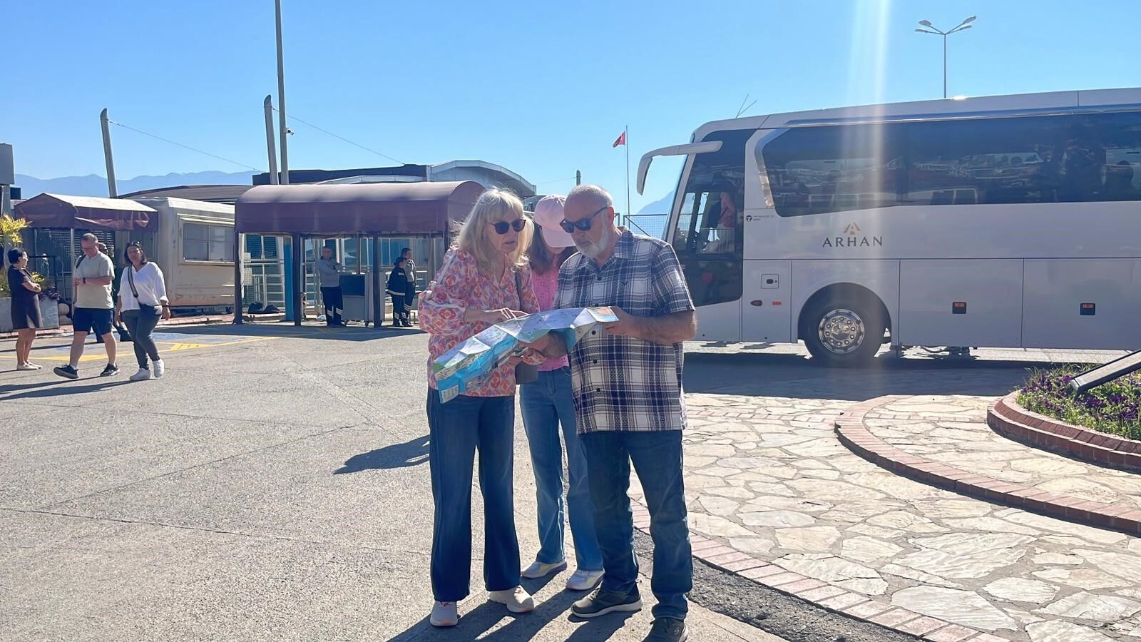Gemiden inen yolcular, Alanya'nın doğal güzelliklerini yerinde görmek üzere iskelede bekleyen otobüsler ile Alanya'yı gezecek.