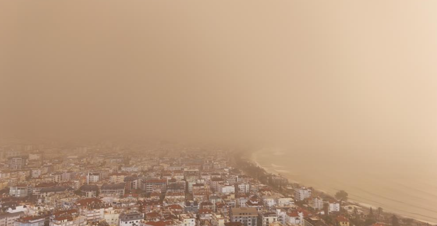 Alanya'da sabah saatlerinde yağışla birleşen toz bulutları ilçe genelinde araçların ve açık alanların üzerini kahverengi çamur tabakasıyla kapladı. Yer yer oluşan su birikintilerinin çamur görünümünde olduğu gözlemlenirken, öğle saatlerinde toz taşınımı ektisini kaybetti.