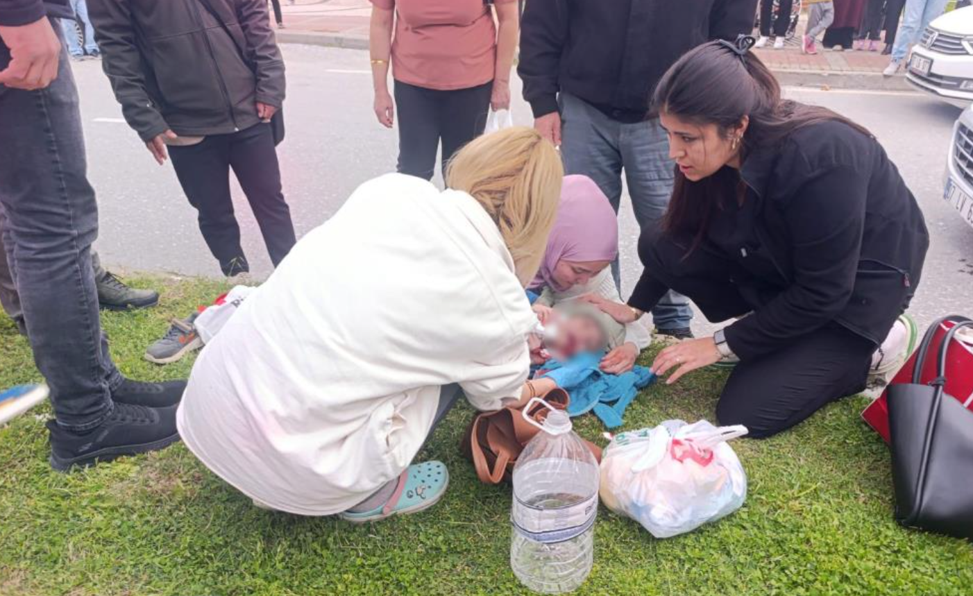 Çarpmanın şiddetiyle savrulan küçük çocuğun yardımına çevredeki vatandaşlar ve araç sürücüsü koştu.