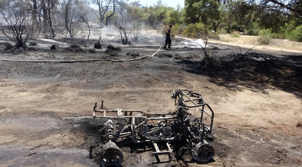 Yangında 1 hektar kızılçam alanı yanarken, bölgede safari turu yapan bir ATV aracı da küle döndü.