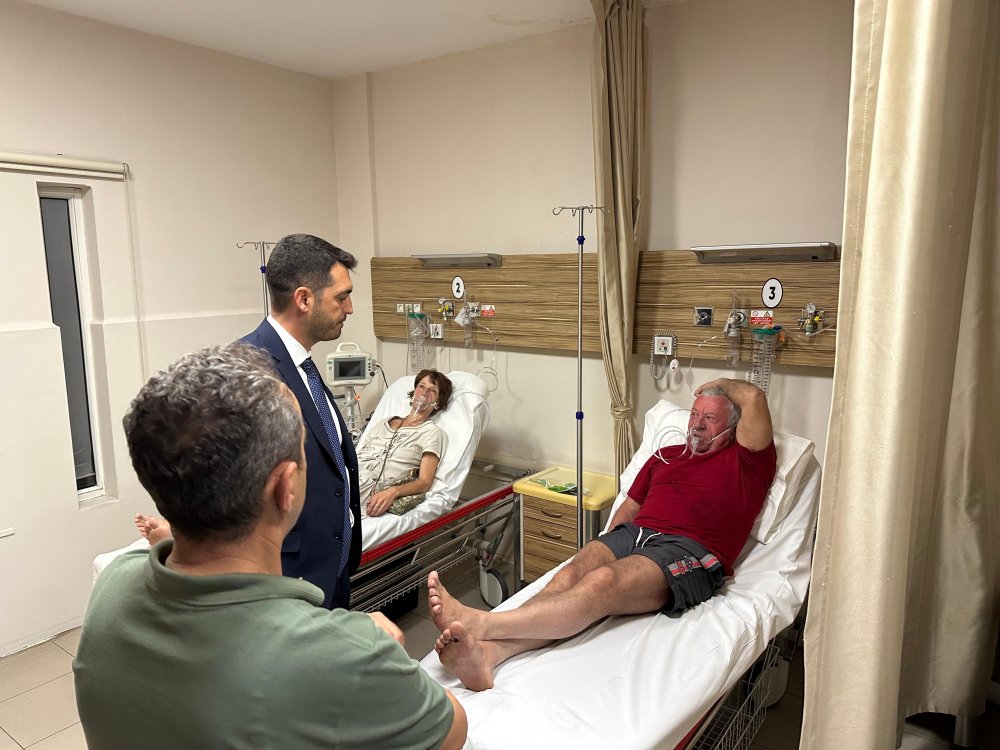Otelde çıkan yangın sonrası Kemer’deki hastanelere kaldırılan turistlere geçmiş olsun ziyaretinde bulunan Başkan Yardımcısı Baytekin ile meclis üyesi Efir, turistlerin bir ihtiyaçları olup olmadığını sordu. Yanlarında oldukları mesajını verdi.