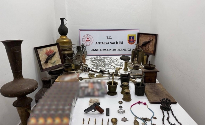 Antalya İl Jandarma Komutanlığı tarafından, Antalya Cumhuriyet Başsavcılığı'nın talimatıyla yürütülen çalışmalar sonucunda, bir şüpheliye ait ikamet ve iş yerinde arama yapıldı. Aramalarda, 457 adet sikke, 58 parça tarihi eser niteliği taşıyan obje, 114 paket kaçak nargile tütünü, 1 adet 7.65 milimetre ruhsatsız tabanca, 11 adet 7.65 milimetre tabanca mermisi ele geçirildi.