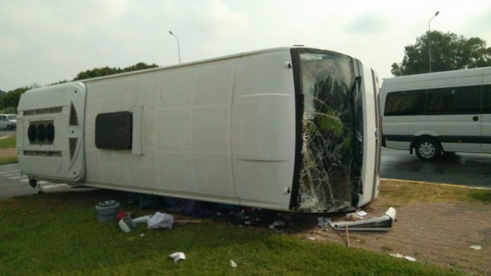 ANTALYA (İHA) Kaza, sabah erken saatlerde Muratpaşa ilçesi Yaşar Sobutay Bulvarı üzerinde meydana geldi. Edinilen bilgiye göre, bir otelin çalışanların taşıyan Sinan A. (72) kontrolündeki 07 D 5202 plakalı servis midibüsü, yolun sulamadan dolayı kaygan olması sebebiyle kontrolden çıktı. Önce refüje çarpan midibüs, ardından yan yattı. Kazayı görenlerin haber vermesi üzerine olay yerine polis ve sağlık ekipleri sevk edildi. Kazada yaralanan Rıdvan Kabağaç (33), Umut Karaboğa ( 24), Mert Ali Eroğlu (16), Hüseyin Cengiz (44), Kırgız uyruklu Meken Nurlenbek (24) ve ismi öğrenilemeyen bir personel, ambulanslarla yakın bölgedeki hastanelere sevk edildi. Yaralıların hayati tehlikesinin bulunmadığı öğrenilirken, sürücüye yaş sınırını aştığı ve eksik evrakı nedeniyle cezai işlem uygulandı.