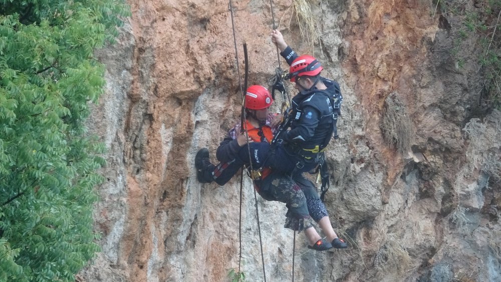 Antalya'da indiği falezlerden yağış nedeniyle geri çıkamayan kadın mahsur kaldı. İtfaiye ekipleri tarafından halat yardımıyla yukarı çekilen kadın kurtarıldı.