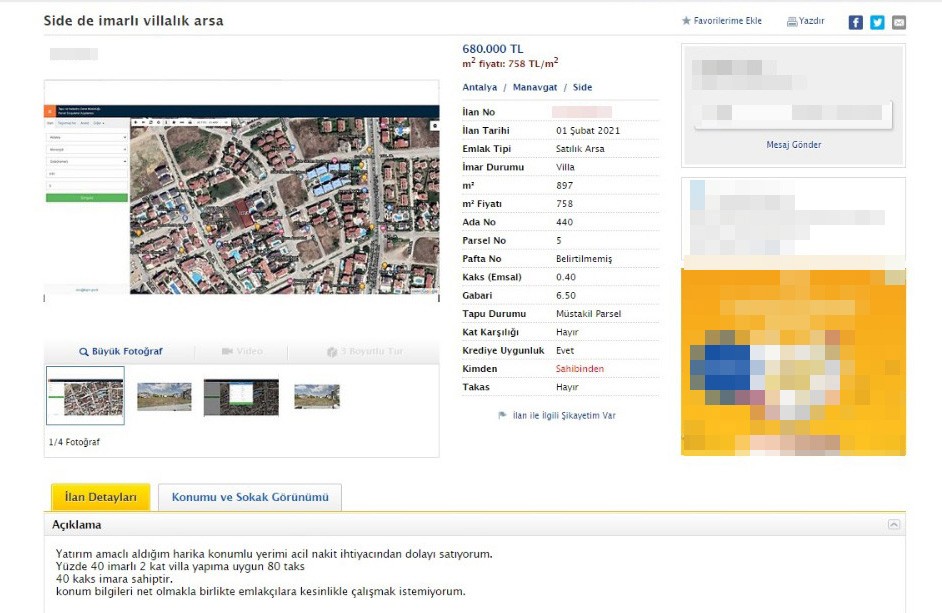 Gayrimenkul, vasıta, alışveriş ürünleri ve hizmetler gibi birçok kategoride ilan ve e-ticaret işlemlerinin yapıldığı online bir platform üzerinden Side’de bulunan bir arsa için satış ilanı veren C.G. isimli şahsın vatandaşlardan kapora adı altında para almak suretiyle dolandırıcılık yaptığı iddia edildi. Sitede yer alan ilandaki arsanın ilanı veren kişiyle hiçbir ilgisinin olmadığı, ilanda belirtilen fiyatın ise arsanın değerinin 1/3’üne rast geldiği bildirildi. Side’de yaşayan ve aynı zamanda muhtarlık azası olan Mehmet Çelikten, sosyal medyada Side Mahallesi'nde 897 metrekarelik arsanın satış ilanını görünce hemen araştırmaya koyuldu. Yapmış olduğu araştırmalarda arsanın sahibine ulaşan Çelikten, arsanın satılması gibi bir şeyin söz konusu olmadığını, ilandaki fiyatın arsanın değerinin çok altında olduğunu öğrendi.