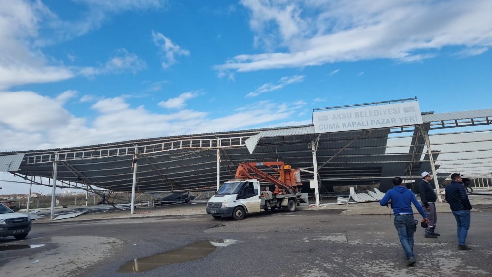 Antalya’nın Aksu ilçesinde Cuma akşam saatlerinde başlayan sağanak yağış ve fırtına, ilçede maddi hasara yol açtı. Kemerağzı Mahallesi’nde bulunan yaklaşık 2 bin metrekarelik kapalı pazar yerinin çatısı çöktü, park halinde bulunan iki tur minibüsünde ise maddi hasar meydana geldi. Olay yerine gelen itfaiye tarafından araçlar bulundukları yerden çıkarıldı. Felaketin boyutları gün ağarınca ortaya çıktı. Cuma günleri pazarın kurulduğu alanda çatının akşam saatlerinde çökmesi, can kaybını önledi. Aksu Belediyesi ekipleri, çöken çatıyı sabah saatlerinden itibaren kaldırmaya başladı.