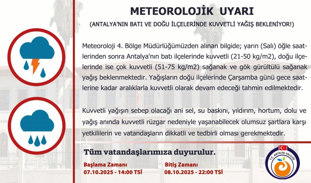 Antalya Valiliği’nden yapılan uyarıda, yağışların 07 Ekim 2025 Salı günü saat 14.00’te başlayacağı ve 08 Ekim 2025 Çarşamba günü saat 22.00’ye kadar süreceği belirtildi.