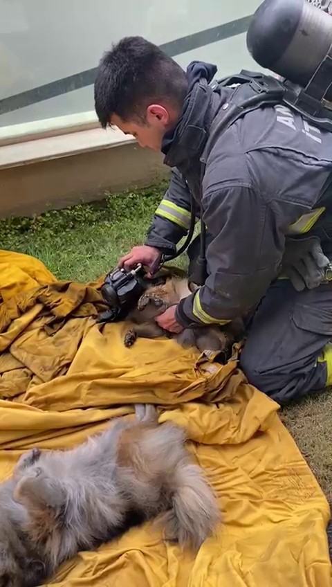 Yoğun duman içerisinde köpeklere ulaşan itfaiye ekipleri 2 köpeği bina dışına çıkarttı. Yoğun dumandan etkilenen ve nefes almakta zorlanan köpeklere itfaiye eri kendi oksijen maskesini takarken, bir yandan da kalp masajı uyguladı. İtfaiye erinin tüm çabalarına rağmen iki köpek kurtarılamadı. Yangına şahit olan apartman görevlisi Ali Bekmezci, komşuların aramasının ardından elektrik şartellerini kapatarak apartman kapısı açtığını ancak yoğun duman nedeniyle daireye giremediğini belirterek, “Yoğun bir duman vardı. Kapıyı açtım, içerisi zindan gibiydi. Göz gözü görmüyor, nefes dahi alınamıyordu. Köpeklerin içerde olduğunu biliyordum. Ama bir şey yapamadım” dedi.
