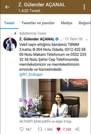 Şanlıurfa Milletvekili Gülender Açanal Hanımefendi sosyal medya hesabından bir çağrıda bulunmuş. Gülender Hanım şöyle söylemiş; Vekil tayin ettiğiniz bendeniz TBMM 3. Katta, B-304 Nolu odada 0312… nolu makam ve 0532… nolu şahsi telefonumda; memleketimizin ve memleketlimizin emrinde ve hizmetindeyim.