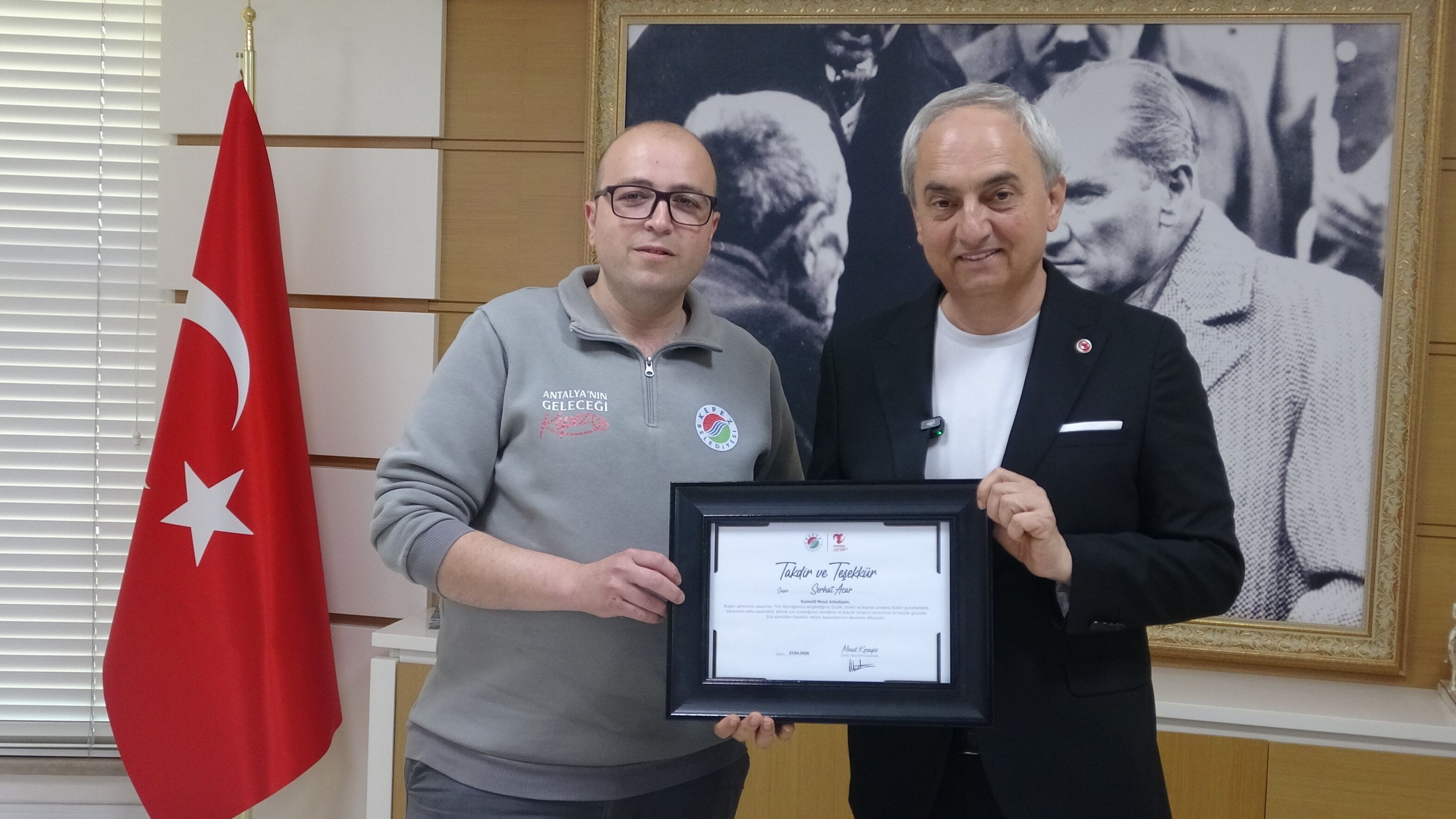 Çöpte bularak muhafaza altına aldığı bayrağı Kepez Belediye Başkanı Mesut Kocagöz'e teslim eden Fen İşleri Daire Başkanlığı'nda kamyon şoförü olarak görev yapan Serhat Acar'a duyarlılığından dolayı teşekkür ve kendilerini gururlandırdığını söyleyen Kocagöz, "Ben inanıyorum ki Kepez'de çalışan bütün mesai arkadaşlarım aynı hassasiyet içerisindedirler.