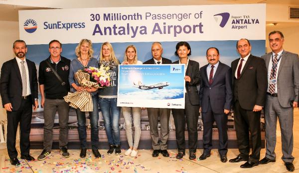 Antalya Havalimanı Birinci Dış Hatlar Terminali'ndeki törene Vali Yardımcısı Aydın Ergün, DHMİ Genel Müdürü Osman Serdar, SunExpress Yer İşletme Grup Müdürü Mustafa Minareci, Fraport TAV Antalya Havalimanı genel müdürleri Gudrun Teloeken ve Deniz Varol katıldı. Almanya'nın Münih kentinden 2 kızı ve eşiyle birlikte SunExpress XQ 131 uçuşuyla Antalya'ya gelen 30 milyonuncu yolcu Petra Hartberger, çiçek ve hediyelerle karşılandı.