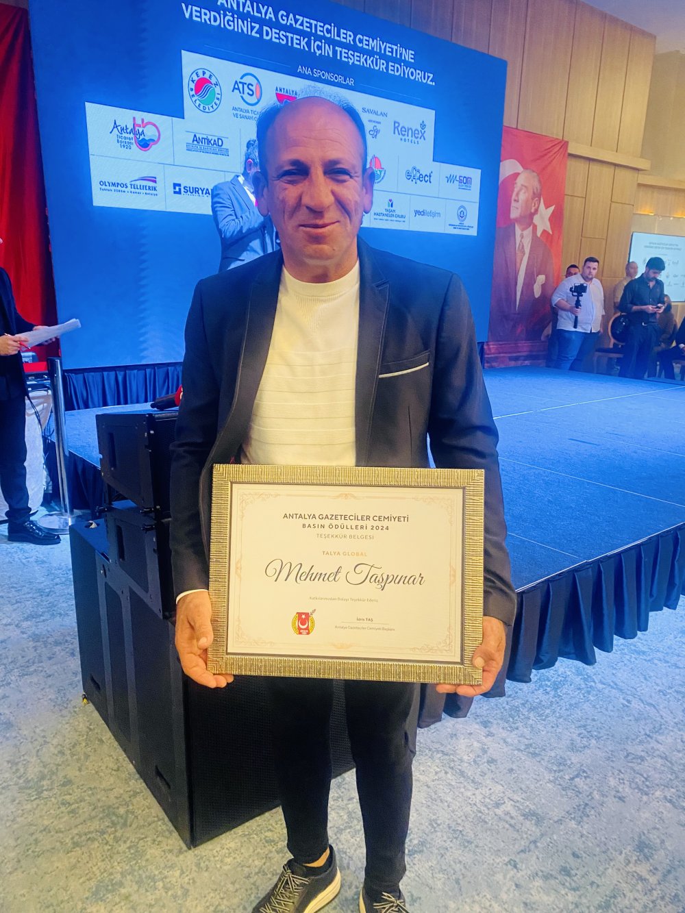 Gecenin sponsorları arasında yer alan Talya Global Yönetim Kurulu Başkanı Mehmet Taşpınar, teşekkür belgesini alarak sahneye çıktı. Aksulu iş insanı Taşpınar, böylesine prestijli bir organizasyonda yer almaktan büyük onur duyduğunu belirterek, “Antalya'da düzenlenen böyle güzide bir programa katılmak ve teşekkür belgesi almak benim için çok değerli” dedi.