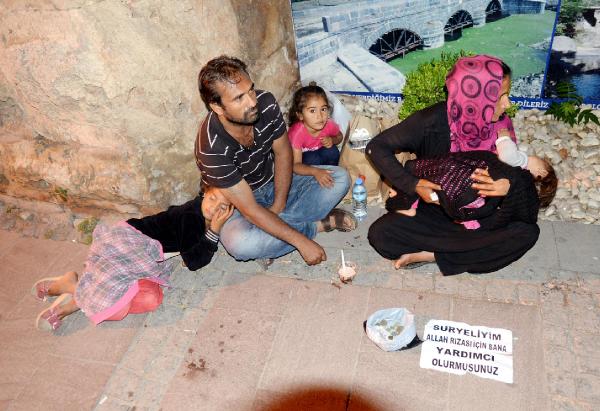 Cumhuriyet Meydanı'ndan başlayıp Kalekapısı'na devam eden kaldırım boyunca ve Dönerciler Çarşısı'ndan Atatürk Caddesi'ne devam eden güzergahta neredeyse her 10 metrede bir, kadın, erkek ve çocuklardan oluşan gruplar dileniyor. Dilenen Suriyelilerin önlerinde ise 'Suriyeliyim, Allah rızası için bana yardımcı olur musunuz?' yazısı bulunuyor.