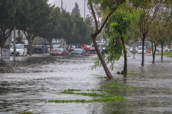 Konyaaltı Sahili'nde denizin rengi, yağmurun taşıdığı toprak nedeniyle çamura döndü. Fotoğraf çekmek için sahile inen bazı kişiler dalgaların arasında kalmaktan son anda kurtuldu. Dalgalar nedeniyle denizdeki atıklar ise sahilde birikti.