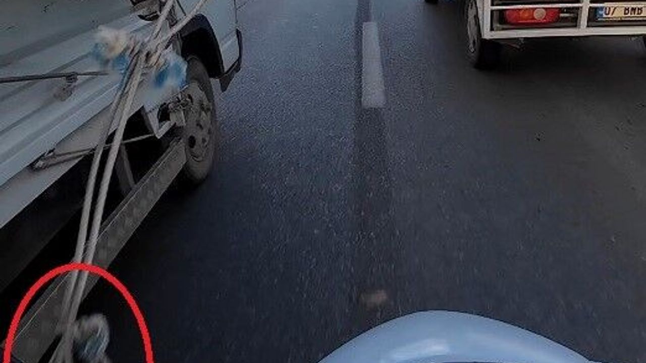Kaza, Aksu ilçesi Serik Caddesi üzerinde meydana geldi. Edinilen bilgiye göre, kurye olarak çalışan motosiklet sürücüsü, önünde seyreden iki kamyonetin arasından geçmek istedi. Motosikleti, iki aracın arasından geçtiği sırada sol şeritteki kamyonetin kasasından sarkan branda ipine takıldı. Dengesini kaybeden motosiklet sürücüsü yola savrularak metrelerce sürüklendi. Kask kamerasına yansıyan görüntülerde, sürücünün yere düştüğü sırada yanındaki kamyonetin hareketine devam ettiği ve arka tekerleklerin altında kalmaktan son anda kurtulduğu görüldü. Kazada yaralanan motosiklet sürücüsünün hayati tehlikesinin bulunmadığı öğrenildi.