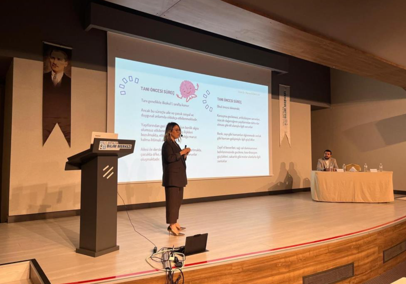 Antalya Bilim Merkezi'nde gerçekleştirilen, "Özgül Öğrenme Bozuklukları: Disleksi ve Disgrafi Semineri yoğun ilgi gördü. Seminerde, Çocuk ve Genç Psikiyatristi Uzm. Dr. Merve Günay Ay ile Özel Eğitim Uzmanı Tolga Yıldırım, özgül öğrenme bozukluklarına ilişkin önemli bilgiler paylaştı. Uzmanlar, özellikle erken farkındalığın çocukların gelişim sürecinde kritik rol oynadığının altını çizdi.