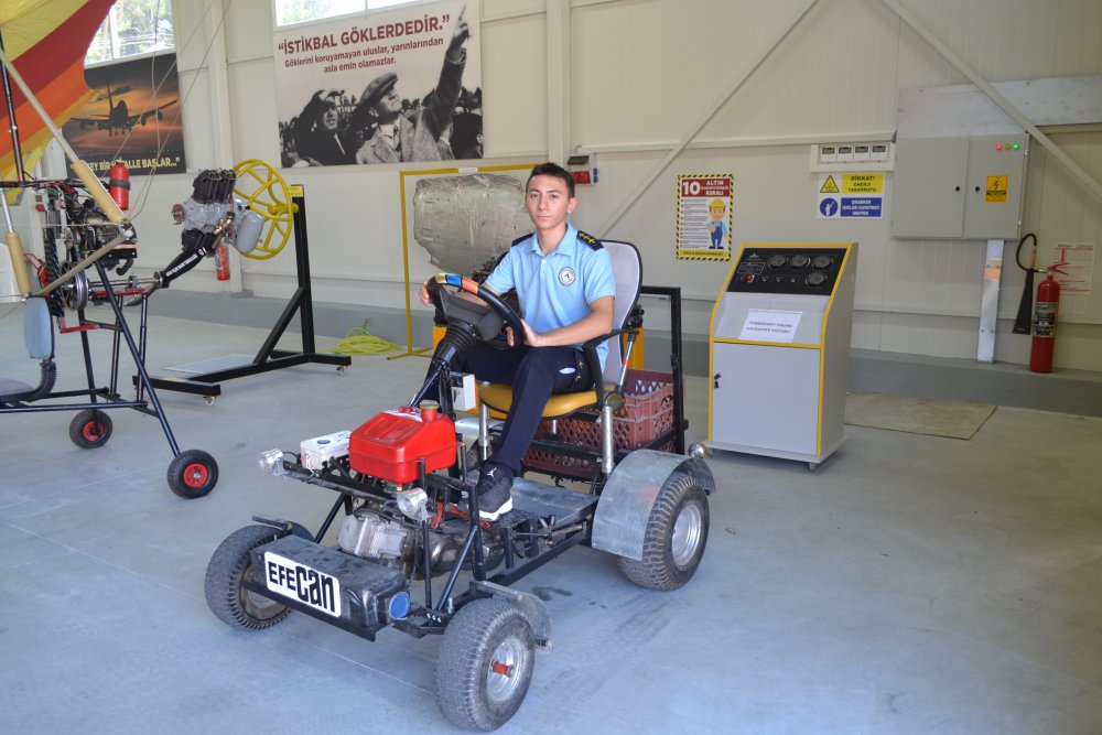 Araçların hepsinin çalışır durumda olduğunu ve okula ait uçak hangarında yerini aldığını ifade eden Efe Can Çakal, “Güneş paneli projesiyle TÜBİTAK’a da katıldık. Kendi enerjisini üreterek çalışan bir makine ve aynı zamanda geri dönüşümü desteklemiş oluyoruz. Maket uçakları, okulumuzda bulunan model uçaklardan biriydi. Dağılmış bir durumdaydı. Okul Müdürümden rica ettim, bunu kendim topladım, revize ettim. İçten yanmalı motoru vardı ve yakıtla çalışan motorunu elektrikli motorla değiştirdim” diye konuştu.