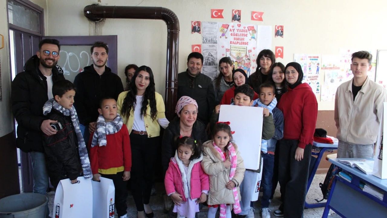 MYO öğrencileri ayrıca el emekleri olan atkıları ve eksik olan kırtasiye malzemeleriyle birlikte okuma kitaplarını köy okuluna hediye etti.